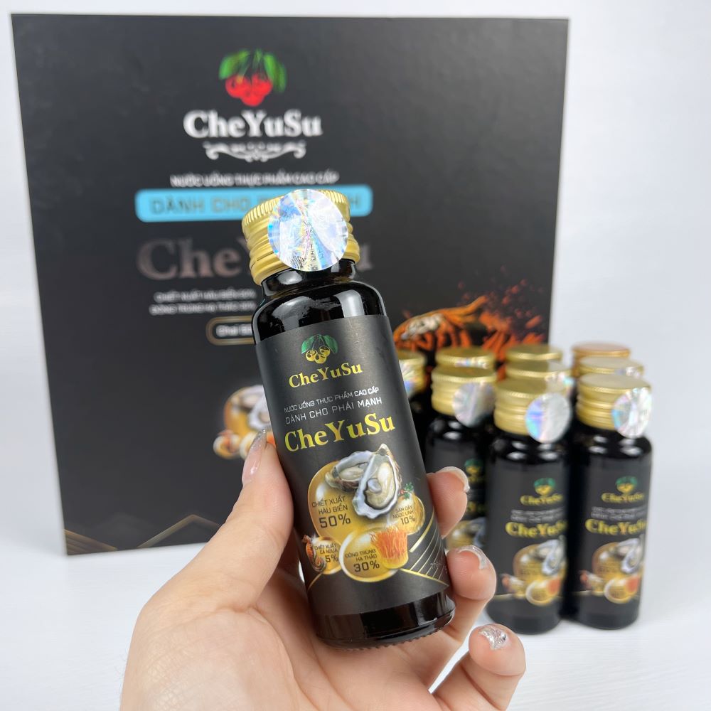 Nước Uống Thực Phẩm Cao Cấp Phái Nam Cheyusu là thức uống dinh dưỡng đặc chế dành riêng cho nam giới, giúp tăng cường sức khỏe toàn diện, hỗ trợ cải thiện sinh lý và nâng cao sức bền cơ thể. Với công thức kết hợp các thành phần thảo dược quý hiếm như Chiết xuất Hàu biển, Đông trùng hạ thảo, Sâm dây Ngọc Linh, Cá ngựa, Yến sào, Collagen, cùng các vitamin và khoáng chất thiết yếu, sản phẩm mang lại giải pháp chăm sóc sức khỏe tối ưu, đáp ứng nhu cầu năng lượng và sinh lực cho phái mạnh trong cuộc sống hiện đại.