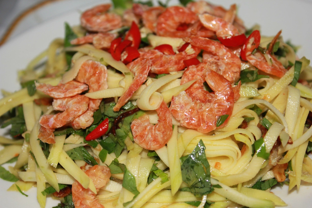 - Gỏi xoài tôm khô: Kết hợp tôm khô với xoài chua, rau thơm, và nước mắm chua ngọt, tạo món gỏi hấp dẫn.