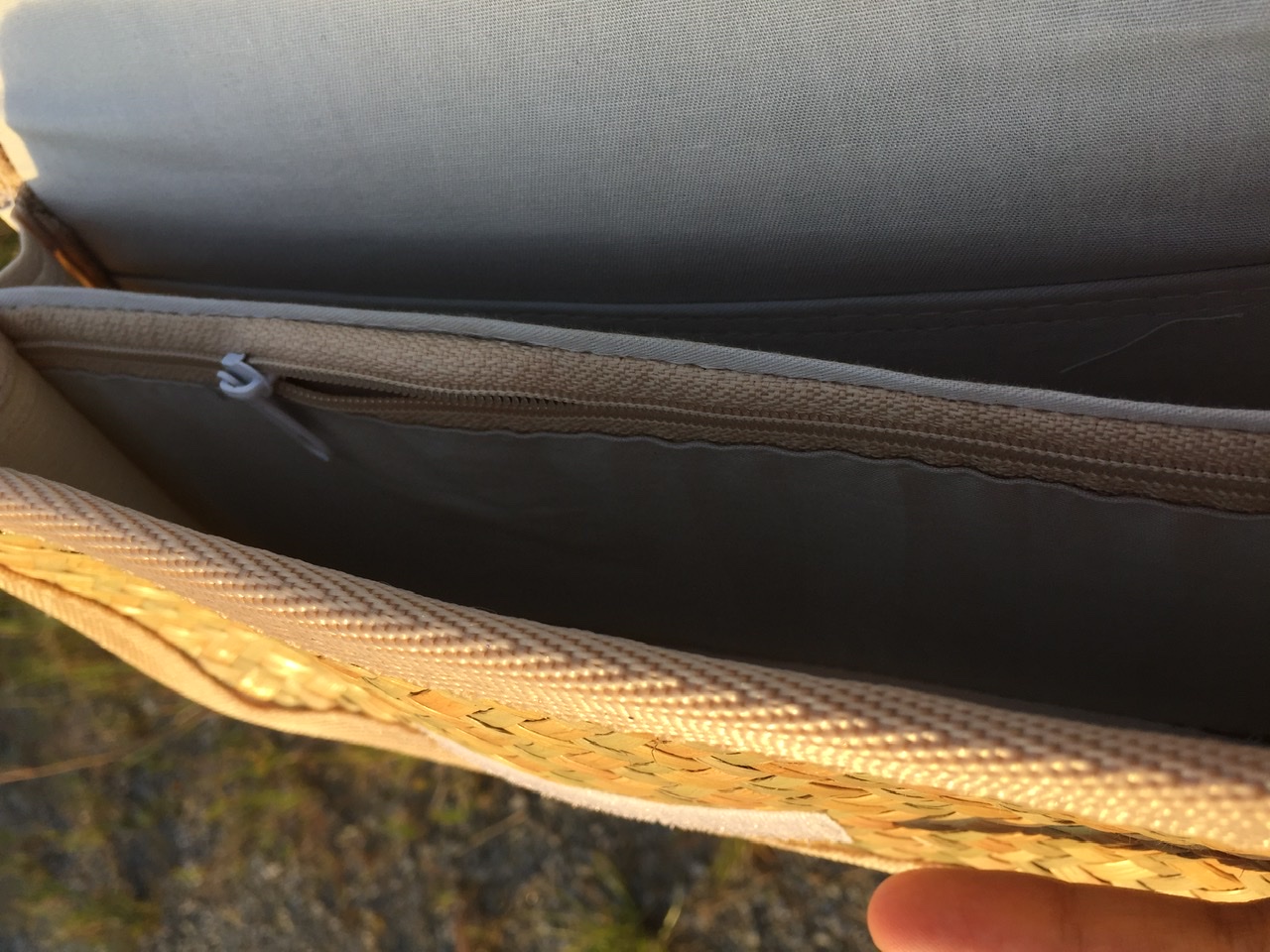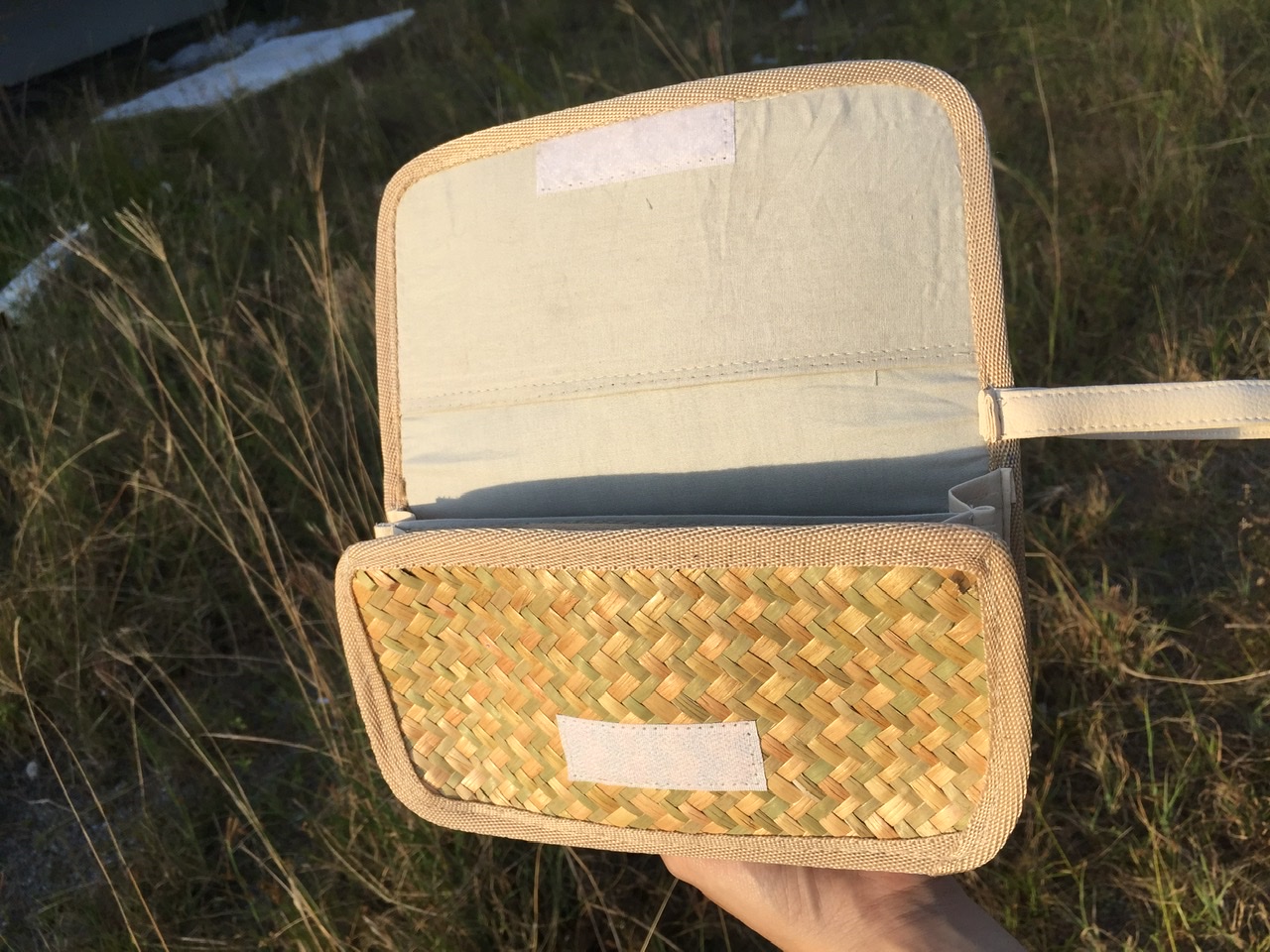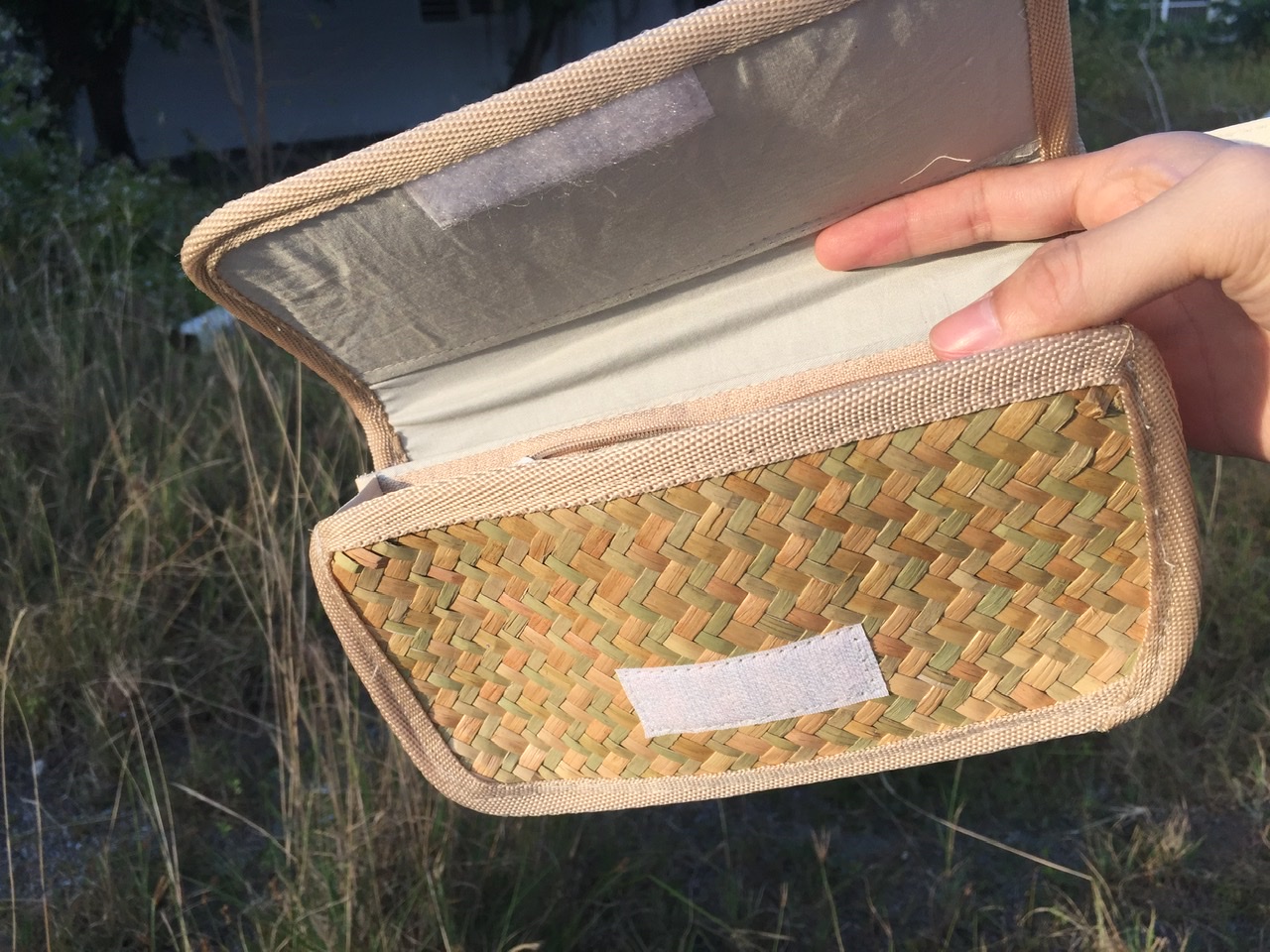 - Lớp ngoài được đan bằng cỏ bàng, với các đường đan tinh tế, tạo nên bộ khung của ví. Lớp viền bằng vải bên ngoài có thể tạo nên cảm giác mềm mại để người dùng để cầm nắm